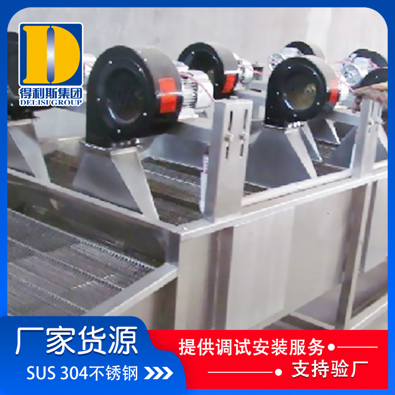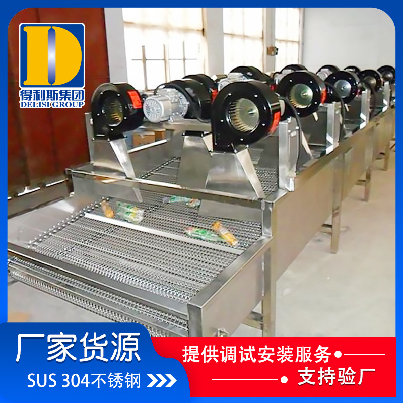 鴨脖食品包裝袋風干機 肉干包裝袋翻轉式風干線主要應用于軟包裝表面水分的吹干,適用于水煮菜、調味菜、醬類、鹵肉、鹵蛋等采用塑料袋包裝的食品,經過高溫(低溫)殺菌、冷卻,用本機將包裝袋表面的水分吹干,以方便迅速裝箱入庫。本機采用低功率,低噪音的風機,吹風口成風刀狀,吹干風溫為常溫,以便更有利于保護物料本身的色澤和品質,效果更佳。本機也可搭配清洗機使用,用于水果、蔬菜的快速吹干瀝水,以便更快地裝箱入庫,節約加工時間。